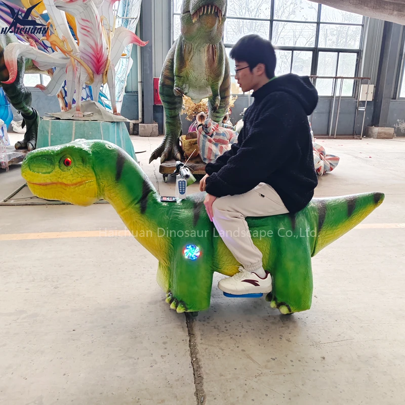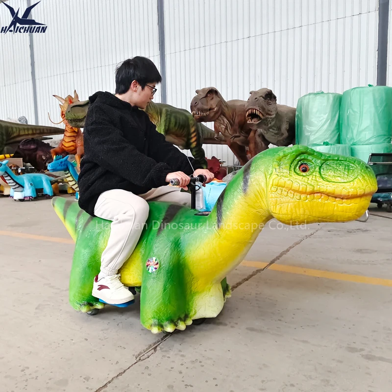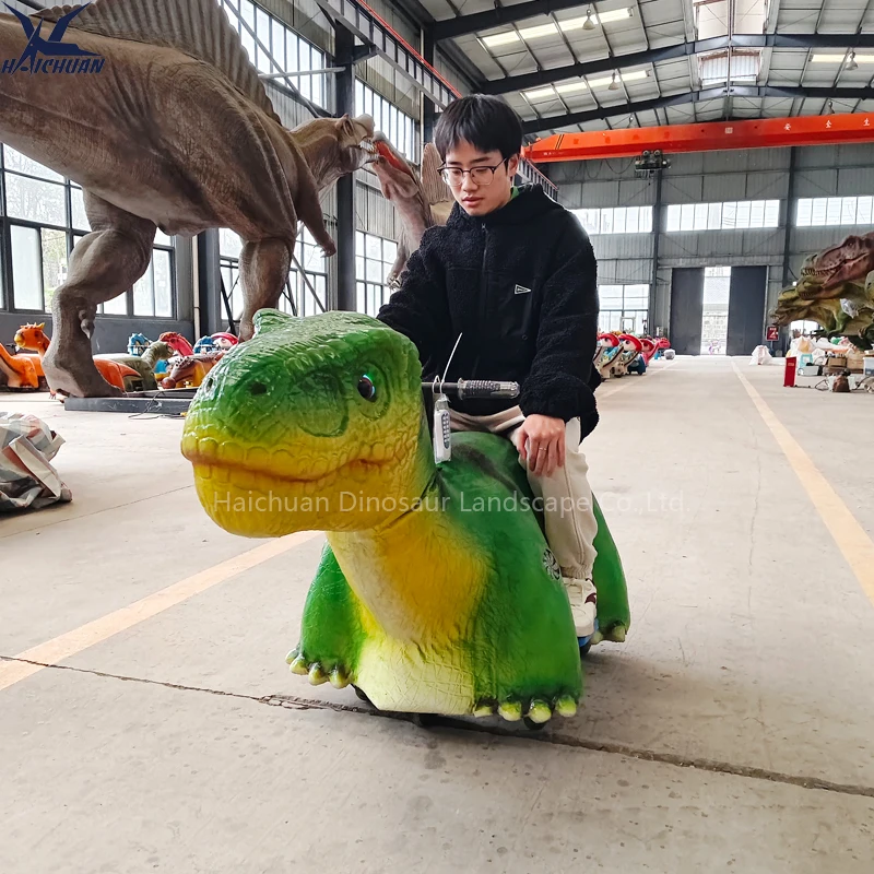 遊園地用子供向け乗り物 ダイナソー型グリーン色バッテリー式Tレックス恐竜カー LEDディスプレイ付き 屋外・屋内使用可能